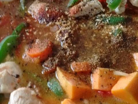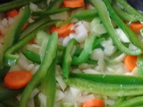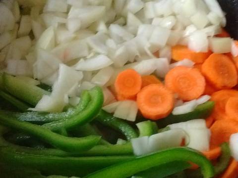 - Pon el caldo de verdura en una sartén y cuando comienza la ebullición, agrega los ajíes morrón, las zanahorias y los zapallitos cortados en tiras finas.